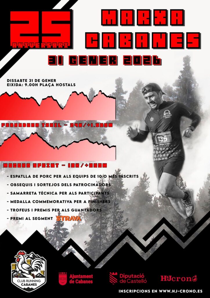 Iniciamos un nuevo fin de semana de competiciones en la 25ª Marxa a peu per Cabanes con una gran representación del grupo. En la Ferradura Trail de 24K con 1000m+ tendremos a Sonia Escuriola, Adrià García, Soraya Julián, Isabel Llorach, Manu Marín, Victor Mulet, Sandra Sandalinas, Juanjo Torner, Chuso Segura y Ruben Villalba. Además, la Mocoró Sprint de 13K con 250m+ contará con la presencia de Raul Bordàs, Paula Branchadell, Saúl Bort, Adrián Cortés, Sara Estupiña, Rober Gil, Elena Martí, Maite Marco y David Mundina.